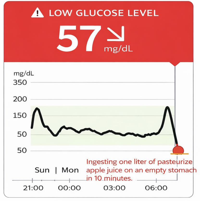 Anyone can verify this next experiment for themselves: drink a liter of fresh fruit juice and see if you experience hypoglycemia. For if there is hyperglycemia, it is necessarily followed by reactive hypoglycemia. As for the blood sugar spike, it is normal whenever one consumes any food that contains sugar, and this is not a problem. This is confirmed by experiment #1 conducted by Hervé, during which he drank freshly pressed juice from 13 Gala apples in just 6 minutes on an empty stomach in the morning. After this fruit meal, Hervé remained physically inactive (tidying his house and working on the computer) for 2 hours during which he felt good.