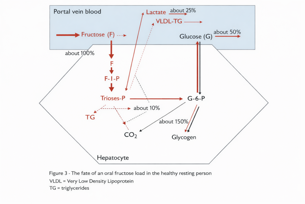 - Fruits mainly contain fructose, which is metabolized by the liver into lactate (25%), glycogen (15%), triglyceride (10%), and glucose (50%) depending on the body’s needs (see diagram 1). Moreover, the regulation of blood sugar (via insulin) is much more effective when sugar is not mixed with fats.