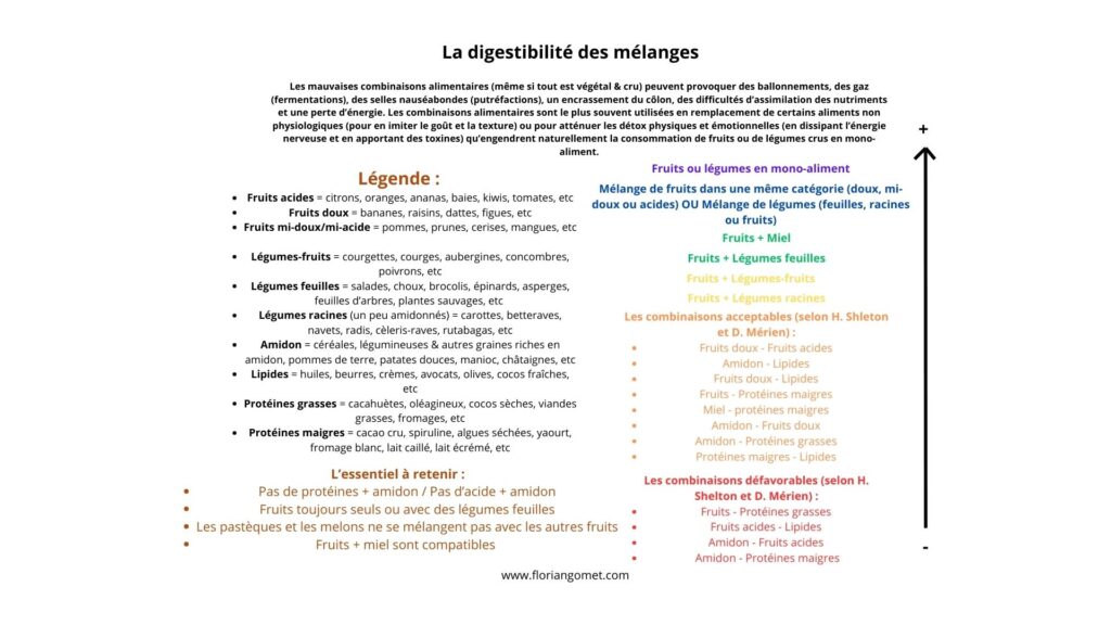 En début de transition, jusqu’au palier 7, lorsque le corps est encore habitué à manger dense et mélangé, il est très utile d’apprendre l’art de la CRUsine car elle aide à trouver la satiété avec le végétal cru. Par la suite, il est préférable de moins mélanger les aliments, voire de les manger bruts, comme cela est enseigné par l’alimentation sensorielle. En attendant, vous pouvez vous aider du diagramme suivant qui résume la logique des combinaisons alimentaires.